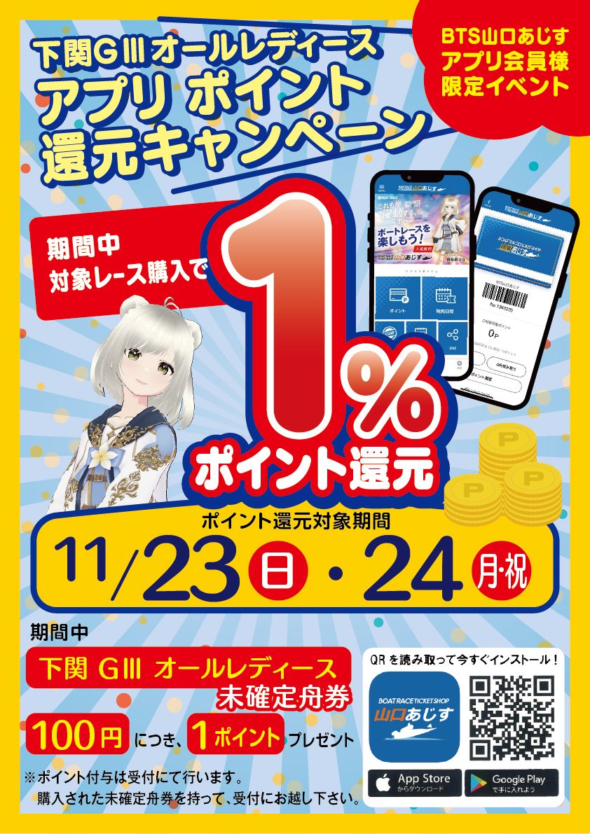 11月23日(日)・11月24日(月・祝)に開催される 下関GⅢオールレディースの未確定舟券 を対象にアプリポイント1%還元いたします🎁