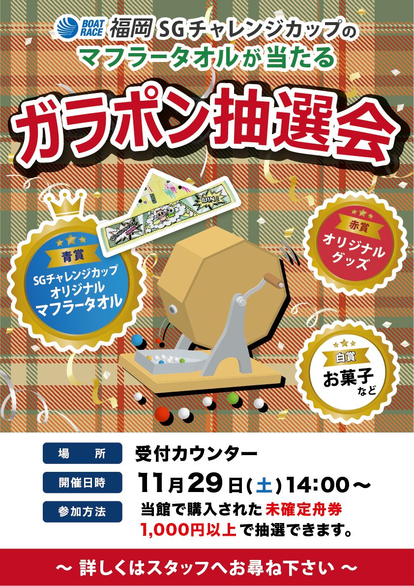 が当たるガラポン抽選会開催🎉 📅11/29(土) ⏰14:00頃~ オリジナルマフラータオル等が当たる 空くじなしのガラポン抽選会を開催します🎁 当館で購入された未確定舟券 1,000円分以上を受付まで お持ちください!