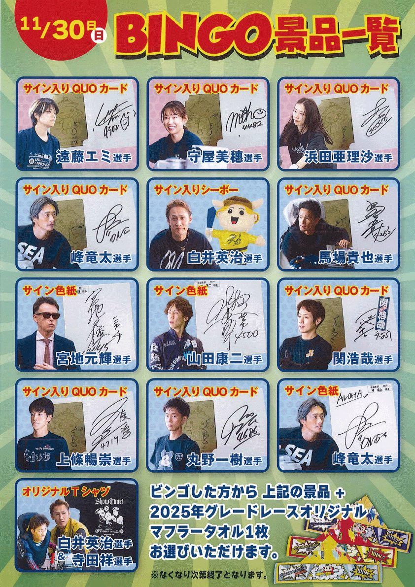人気レーサーサイングッズ・グレードレースマフラータオルなどが当たるBINGO大会を開催します。