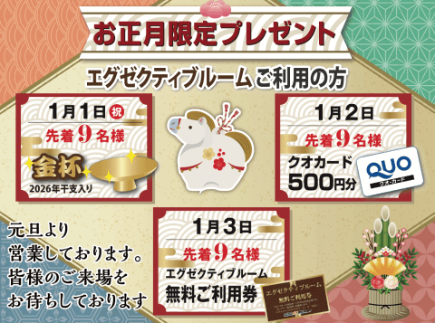 1/3(土)エグゼクティブルーム無料券プレゼント 先着9名様
